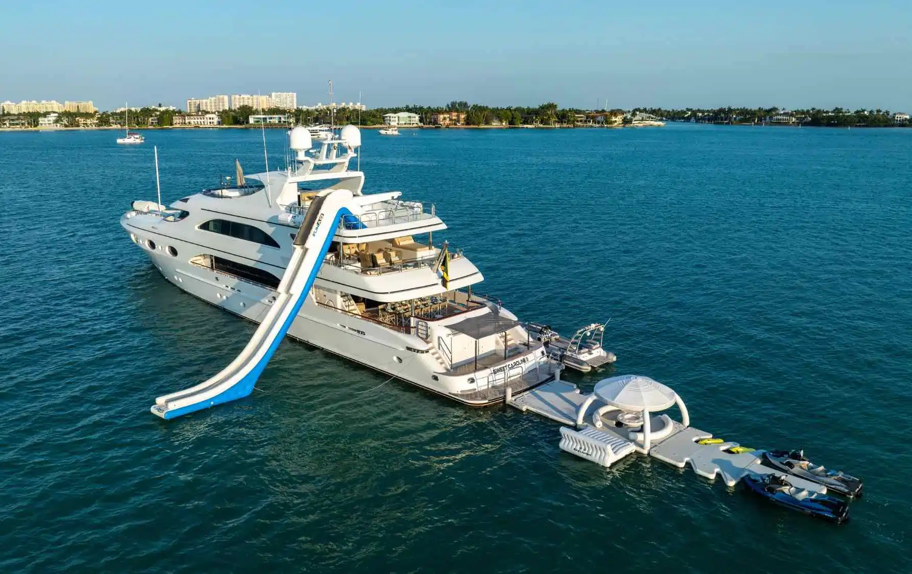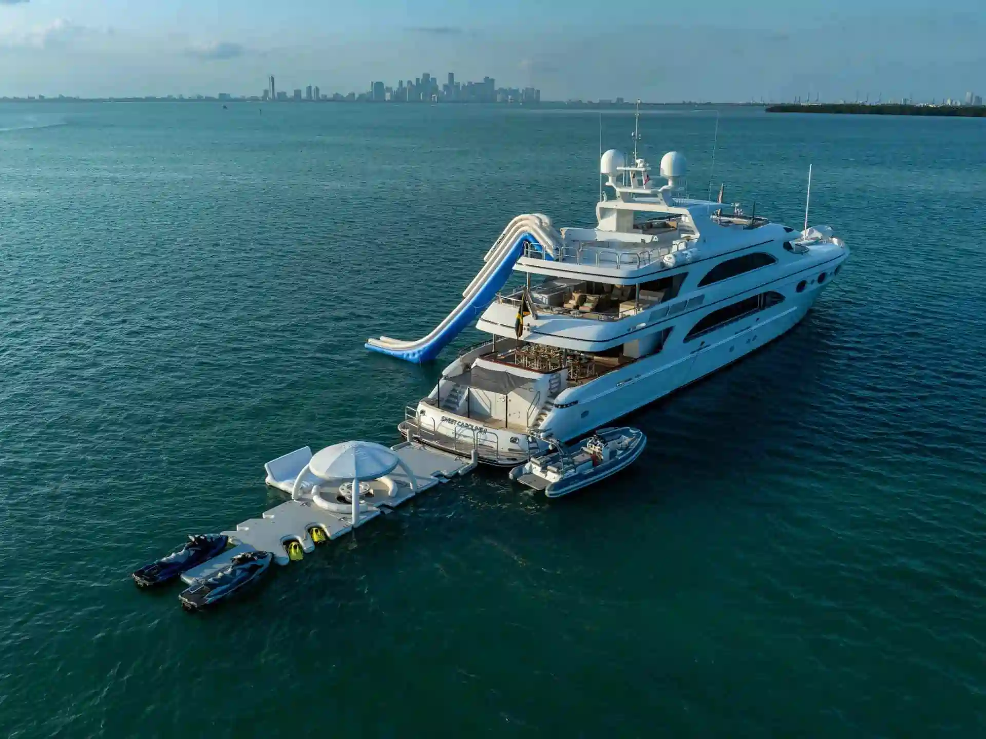 - WATER TOYS: Jacuzzi, 2 JetSkis, 2 SeaBobs, Floating Cabana, Giant Slide, Noodles, Snorkeling Gear, Tender, Various Small Floats